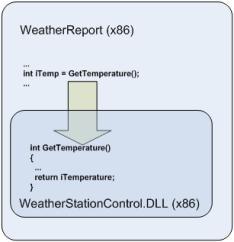 A 32-bit software product contains the main module WeatherReport which calls into the DLL WeatherStationControl. As long as both the main module and the DLL are 32-bit processes the product can run on both 32-bit and 64-bit platforms (inside WOW64). If both the main module and the DLL are migrated to the 64-bit platform, then they can both run in a native 64-bit process. However if only the main module is migrated to 64-bit, it will not be able to load the 32-bit DLL.