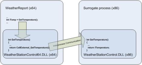A 64-bit wrapper DLL (WeatherStationControl64.DLL) exports the same interface as the original 32-bit DLL (WeatherStationControl.DLL), so providing the same services to the main process (WeatherReport) without you needing to make any changes to the code of either the main process or the 32-bit DLL. This wrapper DLL delegates calls to the 32-bit DLL, which is running in a surrogate process, using IPC.