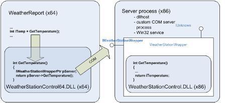 The 32-bit DLL (WeatherStationControl.DLL) is used by a COM object (WeatherStationWrapper) which exposes the interface of the 32-bit DLL as a COM interface. The 64-bit wrapper DLL (WeatherStationControl64.DLL) makes calls to this interface which are delegated to the original 32-bit DLL. The main process (WeatherReport) calls the interface exposed by the 64-bit wrapper DLL but is in fact served by the original 32-bit DLL.